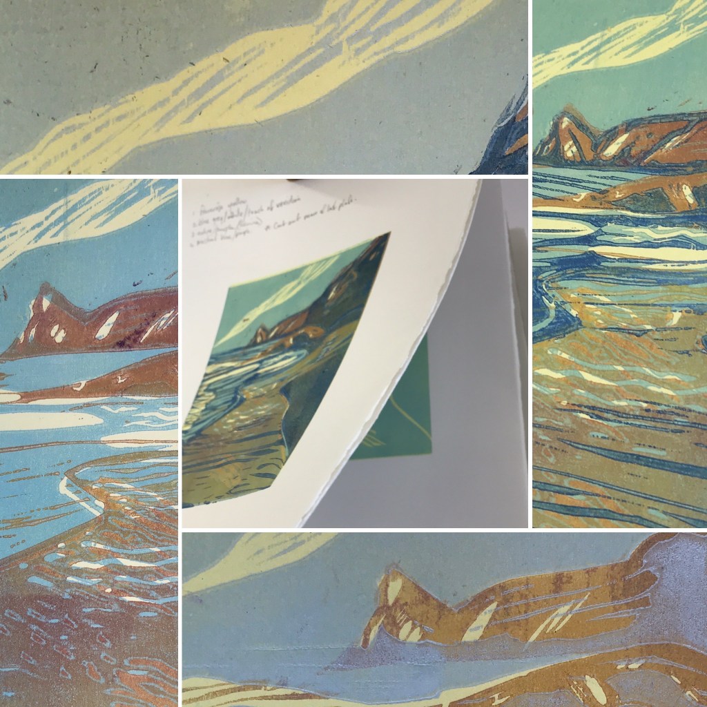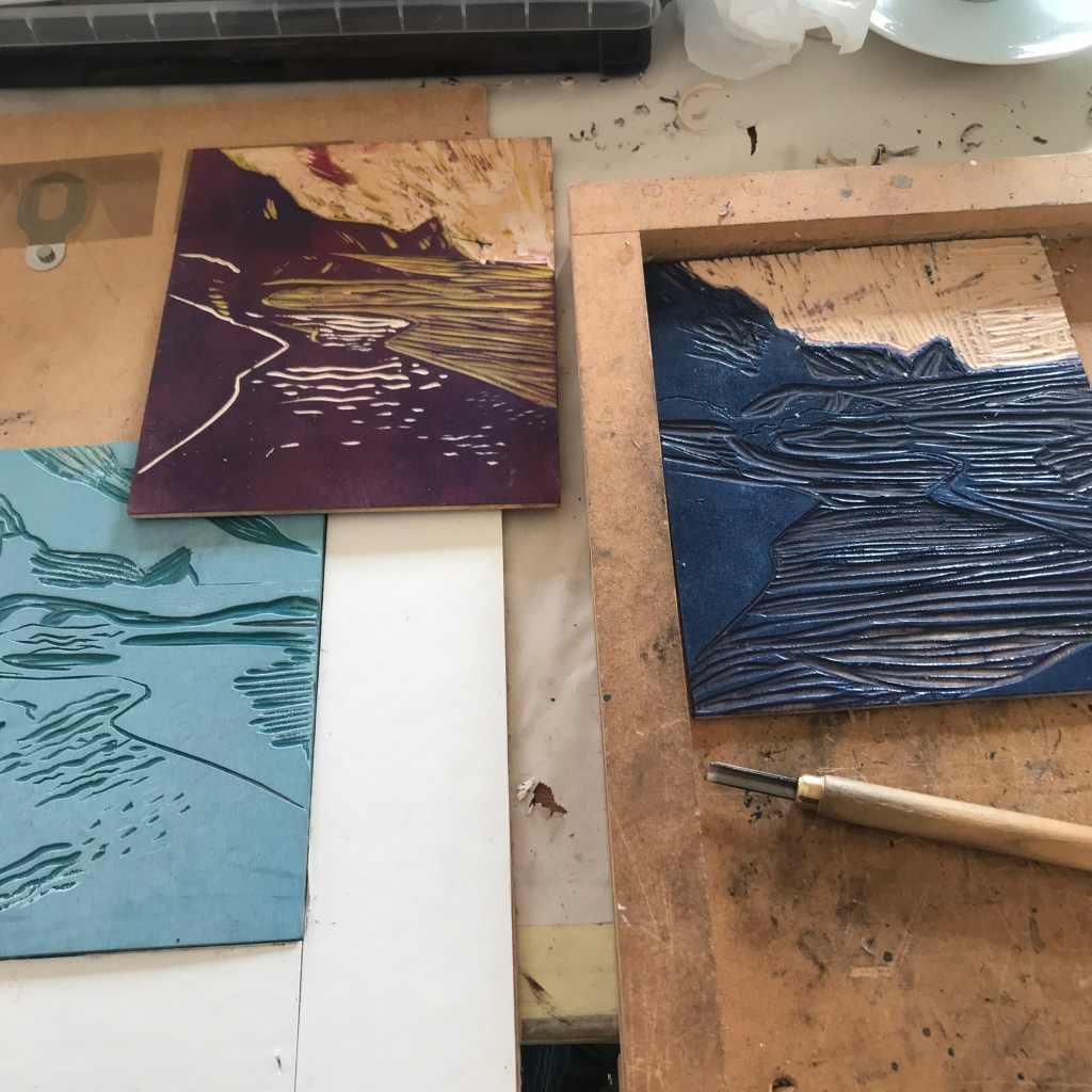 My second session has involved some altering and cutting of woodblocks, a look at colour alternatives and beginning of an exciting, ambitious new woodcut…that I will save for next time.