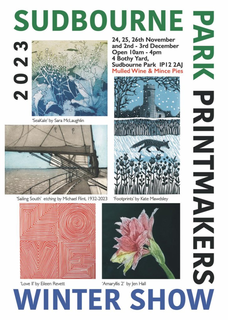 Art for sale, etching, Exhibition, Field views, greeting cards, landscape, linocut, Print Making, Sudbourne Park Printmakers, suffolk open studio, Suffolk, UK, sugar lift, susan whatling, woodcut Winter Exhibition Posted by Susan Whatling on November 28, 2023 Lovely opportunity to enjoy a visit to our studios with festive refreshments. A selection of 30 artists’ work. Greeting cards, calendars, new book, etchings, relief prints and screen prints. Share this: Share on X (Opens in new window) X Share on Facebook (Opens in new window) Facebook Like Loading... Related