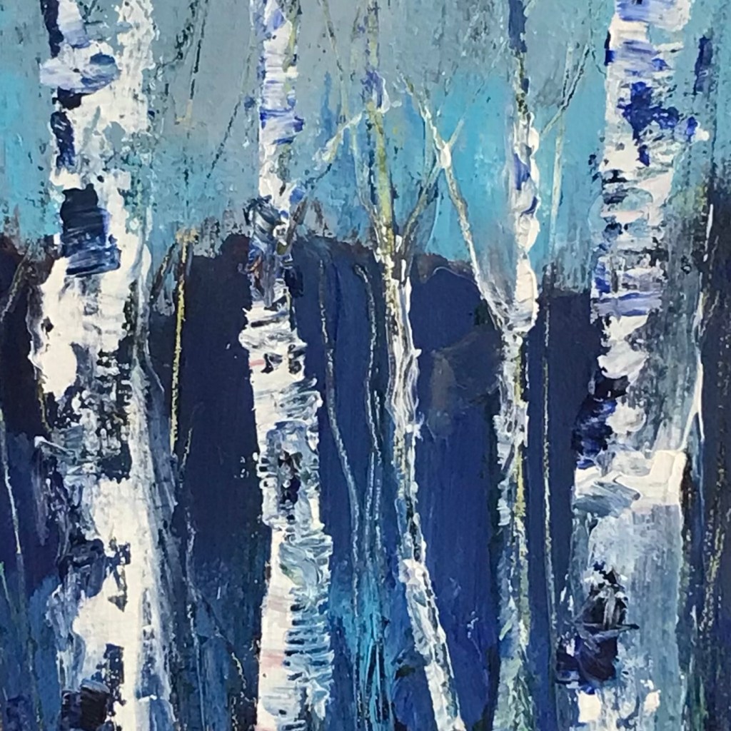 Section of small acrylic painting on canvas board ready to hang in painted white wooden frame.